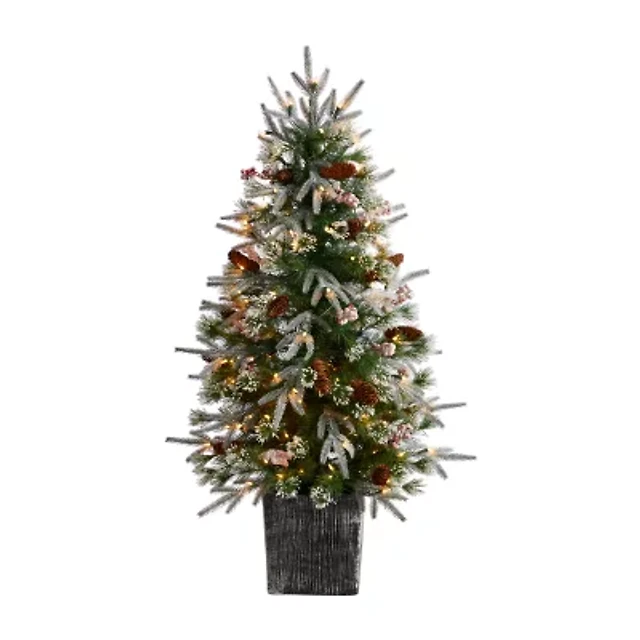 Nearly Natural 4 Foot Frosted Fir In Decorative Planter With Berries And 105 Led Lights Pre-Lit Christmas Tree
