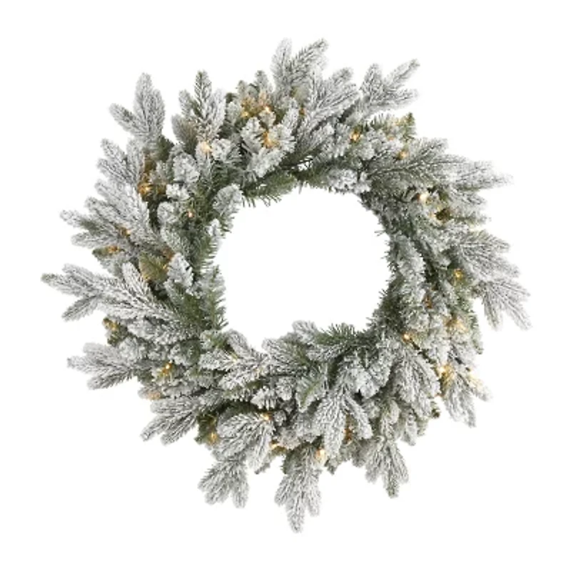 Light up your favorite seasonal accents while adding serious curbside appeal with this artificial Christmas wreath intricately designed from realistic looking seasonal evergreens and finished with a light dusting of faux snow to evoke a winter-wonderland setting. Arriving pre-strung with 50 lights to effortlessly illuminate either a wall or door, this 24" (in circumference) decorative faux wreath makes for an inviting accent and will undoubtedly transform any entrance all throughout the holiday season.
