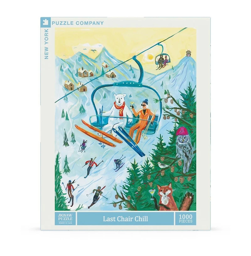 Escape to the snowy slopes with Last Chair Chill, a 1000 piece jigsaw puzzle illustrated by the imaginative Jenny Kroik. This playful and stylish winter scene captures a well-dressed skier effortlessly riding the lift up the mountain, cocktail in hand and perfectly poised-completely at ease next to her unlikely ski companion: a relaxed polar bear.Below, the lively ski trails are bustling with skiers enjoying a perfect powder day, while cozy mountain cabins dot the distant landscape. Look a little closer, and you ll discover charming woodland surprises hidden among the trees-like an owl in a beanie and a fox casually sipping a cocktail of its own.With its rich details, whimsical storytelling, and cool alpine vibe, Last Chair Chill offers a delightful challenge for puzzle lovers who appreciate winter sports, fashionable flair, and a touch of surreal charm. Whether you're a skier, animal lover, or just dreaming of apres-ski leisure, this puzzle is sure to lift your spirits.