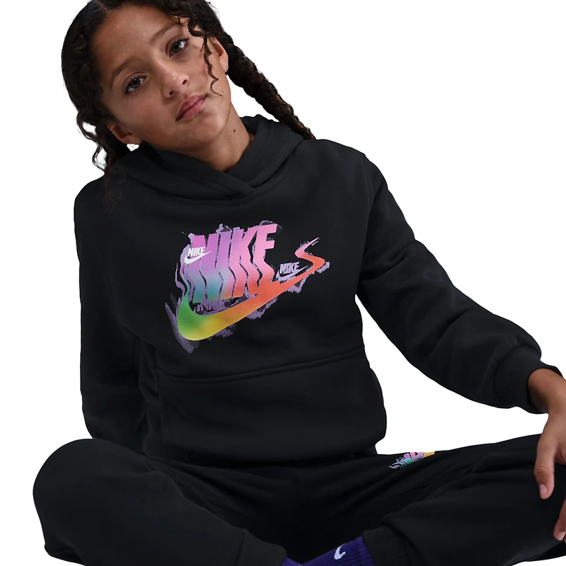 Glitch out in style! The Nike NSW Glitch Club Fleece Hoodie is perfect for kids who love a hoodie that's anything but ordinary. Smooth on the outside and brushed soft on the inside, this lightweight fleece hoodie delivers cozy warmth to your boys without the bulk—making it great for layering across seasons. The large front pocket is perfect for stashing small essentials or warming up chilly hands, while the ribbed hem and cuffs help keep the fit snug and the cold out. Let your kids add a glitchy twist to their chilly-day rotation with the Nike NSW Glitch Club Fleece Hoodie.