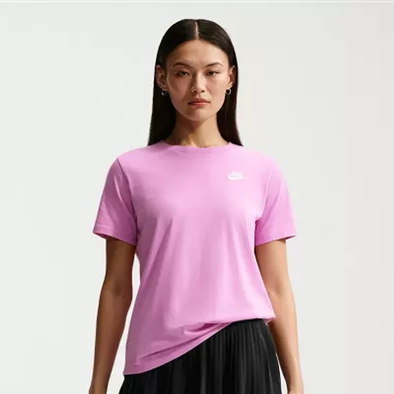 Nike Sportswear Club Essentials Women's T-Shirt We updated our Club Essentials T-shirts to give them an easy fit and modern look perfect for everyday wear. A little wider, a touch shorter in the body and a slightly curved hem give this always-comfortable top its updated look. More Details: Body: 50-100% cotton/0-50% polyester, Material percentages may vary. Check label for actual content, Embroidered logo, Machine wash, Imported.