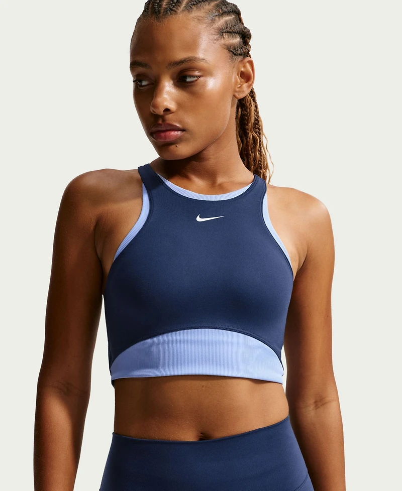 Experience all-day comfort or dynamic workouts in this medium-support padded sports bra from Nike One. A ribbed lining and removable pads offer a snug, customizable fit.