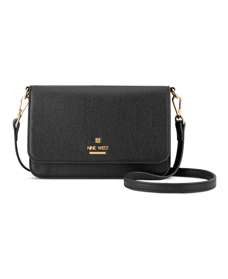 Nine West designer phone case crossbody clutch with internal slip and zipper pocket organization and external hardware details and branding. Remove adjustable crossbody strap to use just as wallet as well, includes phone snap pocket