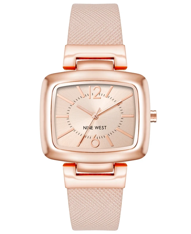 Nine West Women's Quartz Rectangular Rose Gold-Tone and Pink Polyurethane Leather Band Watch, 29mm