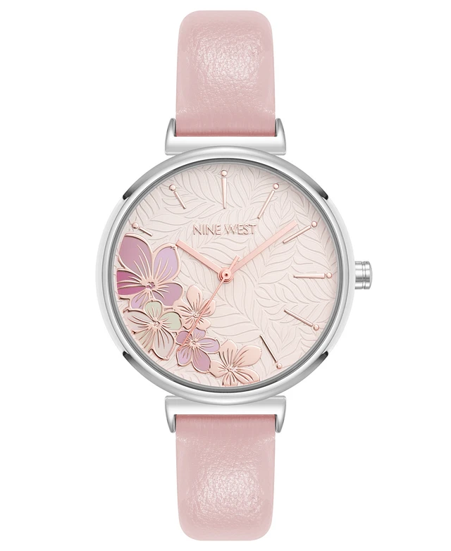 Nine West Women's Quartz Boyfriend Silver-Tone and Light Pink Polyurethane Leather Band Watch, 36mm