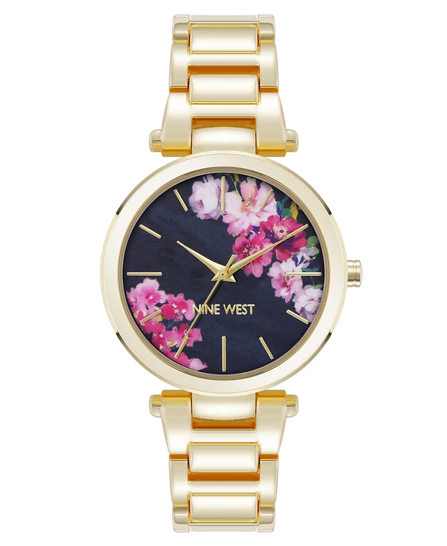 Nine West Women's Quartz Gold-Tone Metal Alloy Delicate Floral Dial Watch, 36mm