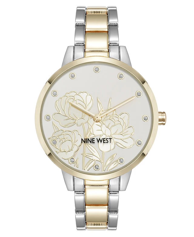Nine West Women's Quartz Two-Tone Metal Alloy Embossed Floral Dial Watch, 36mm