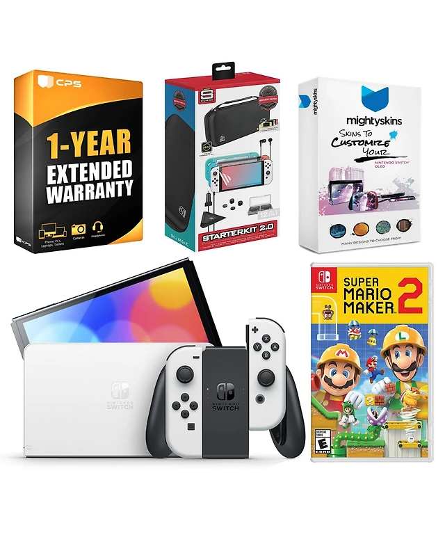 Nintendo Switch White Oled Console with Mario Maker 2, Surge Accessory Gaming Kit, MightySkins Console and Controller Skin Voucher