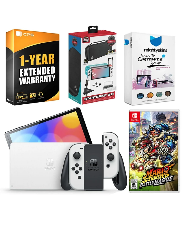 Nintendo Switch White Oled Console with Mario Strikers: Battle League, Surge Accessory Gaming Kit, MightySkins Console and Controller Skin Voucher