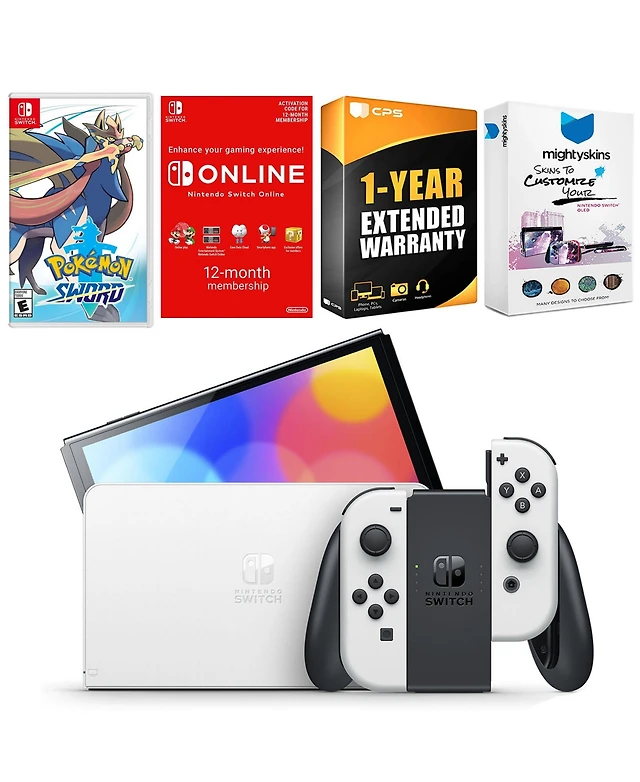 Nintendo Switch White Oled Console with Pokemon Sword, Nso 12 Month Family Membership, MightySkins Console and Controller Skin Voucher