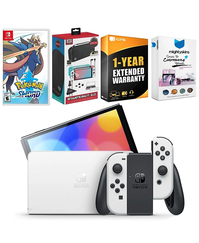Nintendo Switch White Oled Console with Pokemon Sword, Nintendo $20 eShop Gift Card, MightySkins Console and Controller Skin Voucher