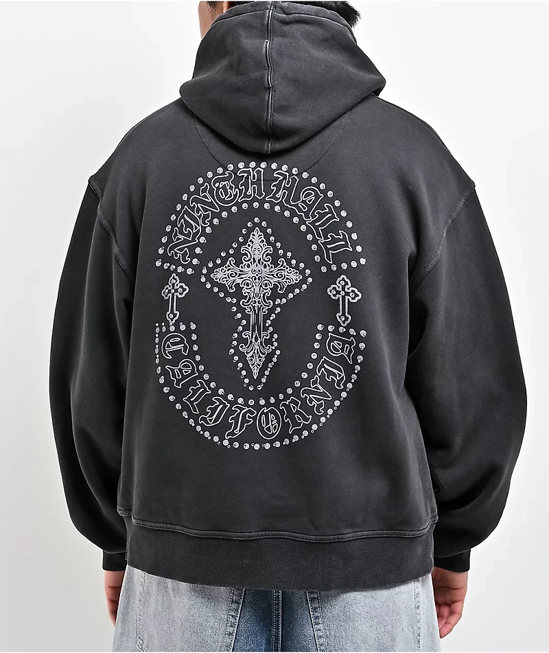 The Tone Def hoodie arrives from Ninth Hall in a washed charcoal cotton blend with printed graphics accented by rhinestones on the front and back. Inspired by designer gothic streetwear, the chest highlights Old English branding with crosses while th
