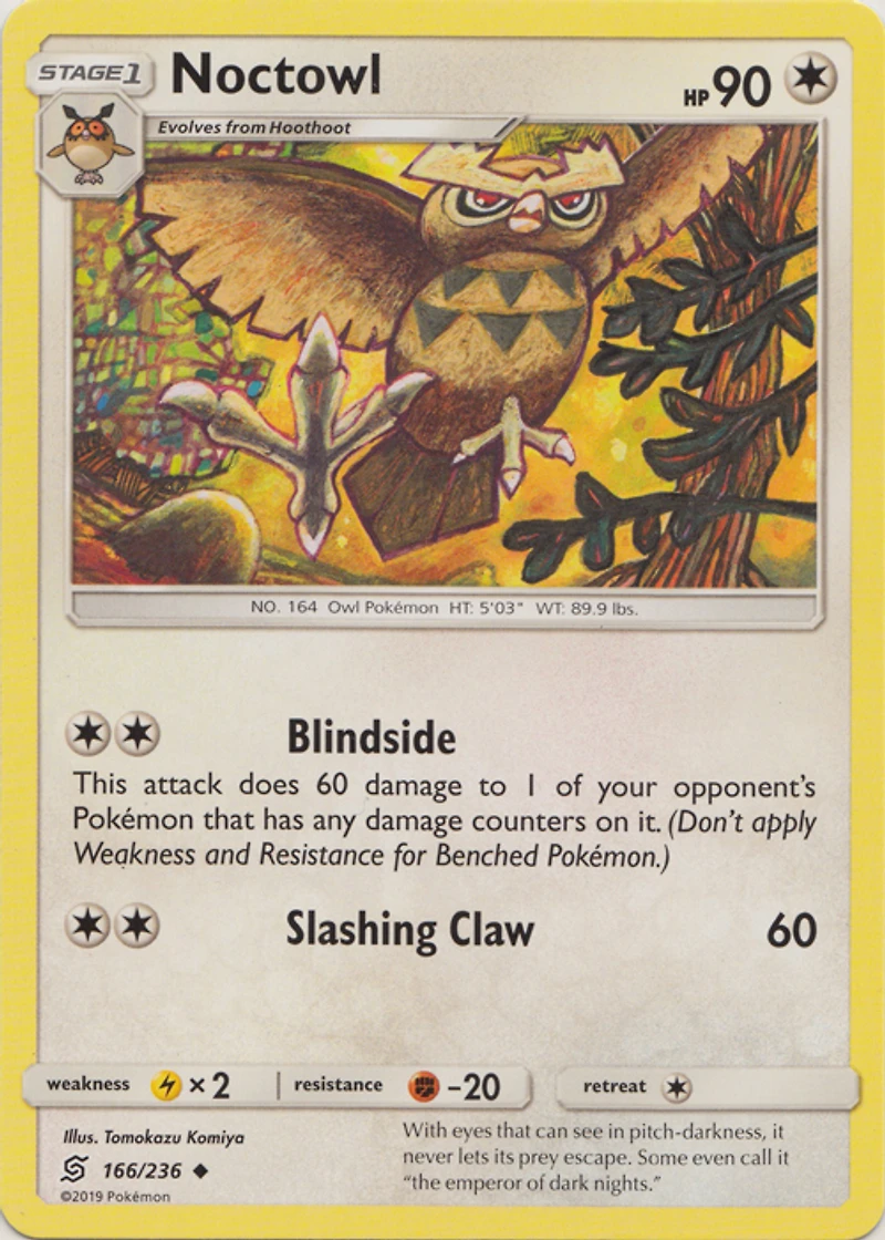 Set: Unified Minds Card Number: 166/236 Rarity: Uncommon Retreat Cost: 1 Weakness: Lightning HP: 90 Stage: Stage 1 Card Type: Colorless Resistance: Fighting Name: Noctowl Finish: Regular Attack #1: [2] Blindside This attack does 60 damage to 1 of your opponents Pokmon that has any damage counters on it. (Dont apply Weakness and Resistance for Benched Pokmon.) Attack #2: [2] Slashing Claw (60)