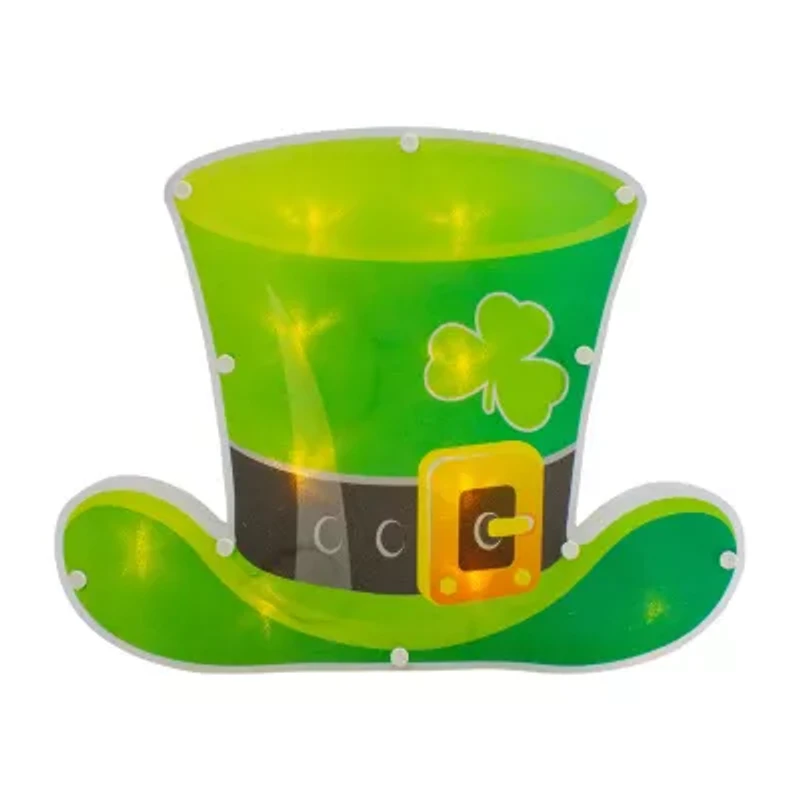 Spread Irish blessings this St. Patrick's Day! This super fun led leprechaun hat silhouette is the perfect addition to your holiday decorations. A traditional green hat with a cloverleaf and black belt with a golden buckle. Equipped with energy-efficient led lights for long-lasting use. Product features: color: warm white bulbs / white wire. "Warm white" also known as "warm clear" has a soft natural incandescent glow similar to candlelight. Number of bulbs: 10. Bulb size: concave wide angle. 24" lead cord. One-sided design. Fully assembled. Additional product features: led lights use 90% less energy. If one bulb burns out the rest will stay lit. For indoor use only. Timer function allows the lights to work for 6 hours and then switch off for 18 hours cycle repeats daily. Requires 3 "aa" batteries (not included). Comes with 1 suction cup for hanging. Non-replaceable bulbs. Cannot be connected to other lighted items. Dimensions: 9.5"h x 12.5"w. Material(s): plastic/wire