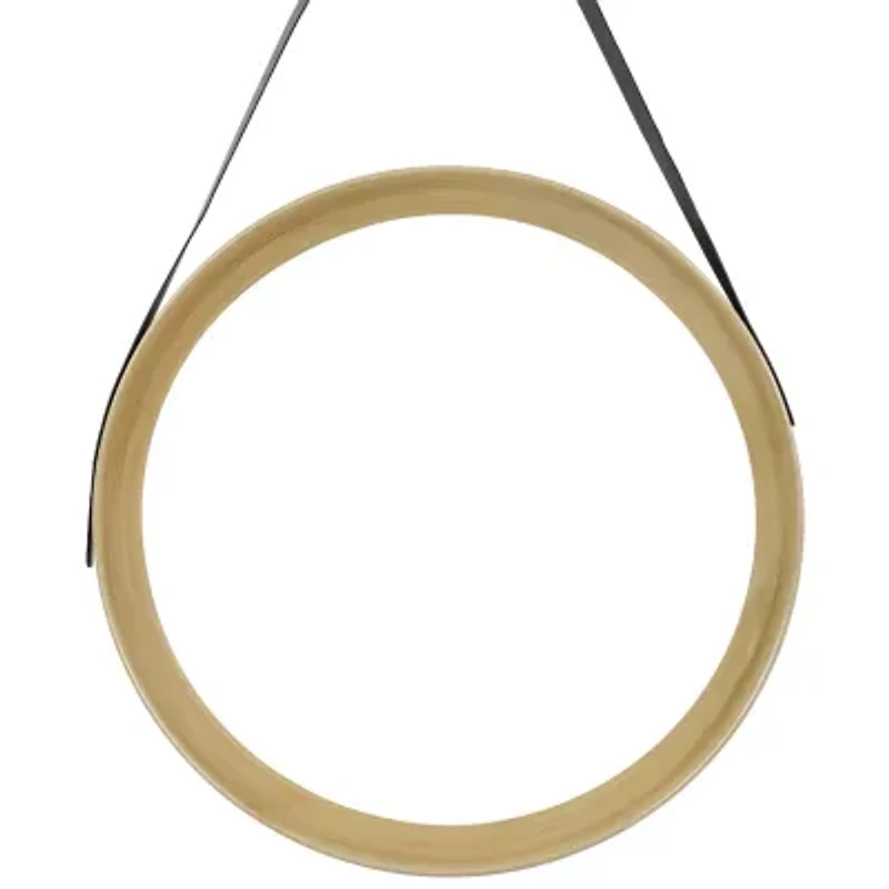 This round mirror features a beautiful brownish gold wood like finish frame that adds warmth and sophistication to any room. The frame has a subtle sheen that catches the light and draws attention to the mirror's elegant shape. The unique hanging strap adds a modern feel. Timeless and versatile it's a great addition to a variety of decor styles. This mirror is sure to become a beloved piece in your home for years to come. Features: round wood finish mirror. Easy to hang from attached strap. For indoor use only. Dimensions: 20" in diameter x 1.5" deep. Hanging height: 31" with strap. Materials: plastic/glass