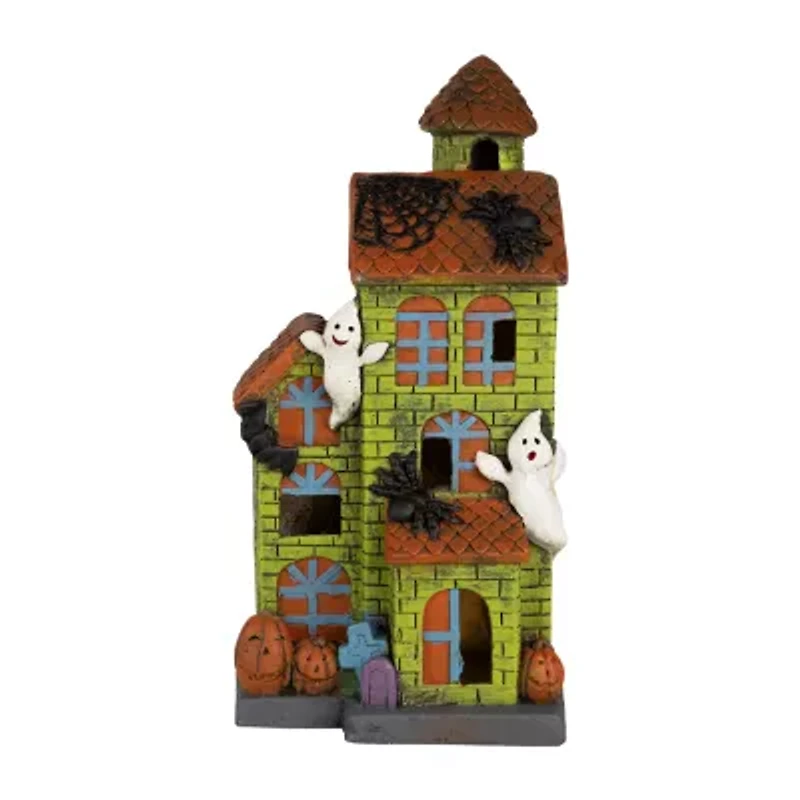 Get ready to experience spine-chilling thrills with this pre-lit haunted house decoration. This enchanting, haunted house features a captivating blend of green and orange hues complemented by striking black accents. This ghoulish masterpiece comes with an eerie combination of ghostly apparitions jack-o'-lanterns tombstones bats and creepy spiders. With its led lights this haunted house will surely send shivers down your spine. Prepare for a hair-raising adventure and let your imagination run wild in the realm of the supernatural! Product features: haunted house Halloween decoration. Pre-lit from within with warm white led lights. Light shines through the building's door and windows. Accented with ghosts jack o lanterns tombstones and spiders. Requires (3) aa batteries - not included. On/off switch and battery pack located at the bottom of the building. For indoor use only. Dimensions: 20"h x 10"w x 7.25"d. Material(s): ceramic