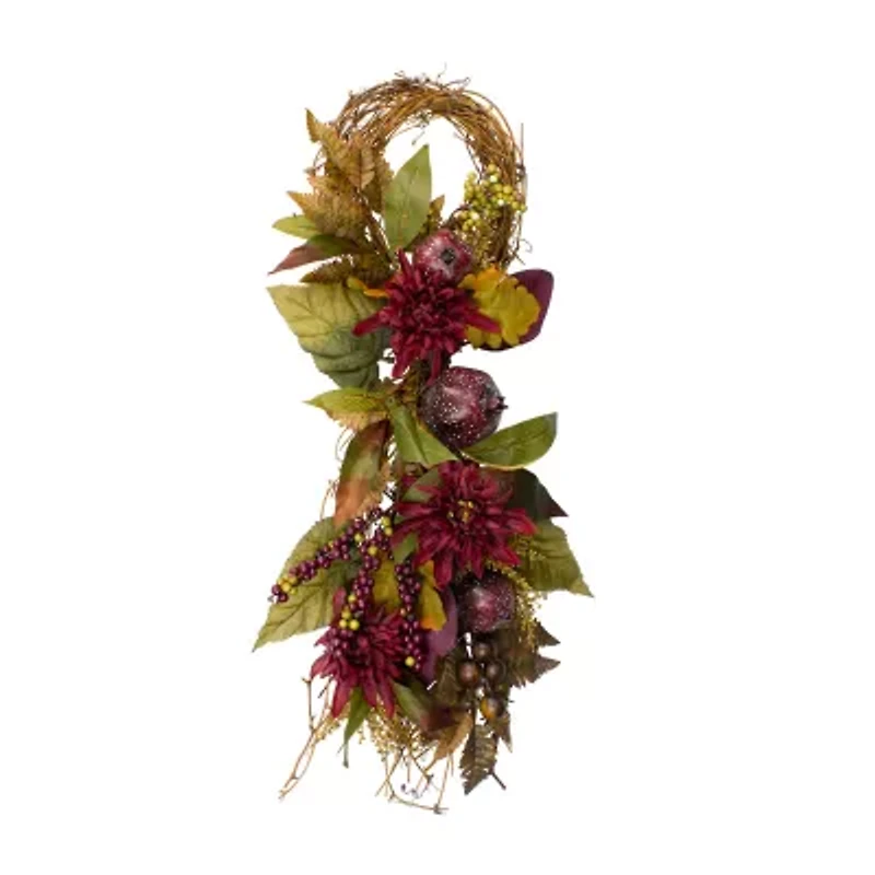 Welcome the autumn season with this festive mum and pomegranate teardrop swag! It will add a pop of color to your thanksgiving and fall decor. This swag is perfect for any empty space on your walls doors and above mantles in your home or office. Product features: autumn harvest thanksgiving teardrop swag in burgundy, green and brown. Features acorns pinecones pomegranate berries and leaves. Natural twisted grapevine twig backing for easy hanging. Unlit. For indoor use only. No assembly required swag comes in 1 piece. Dimensions: 28"h x 12"w x 4"d. Material(s): grapevine/plastic/polyester/foam/wood