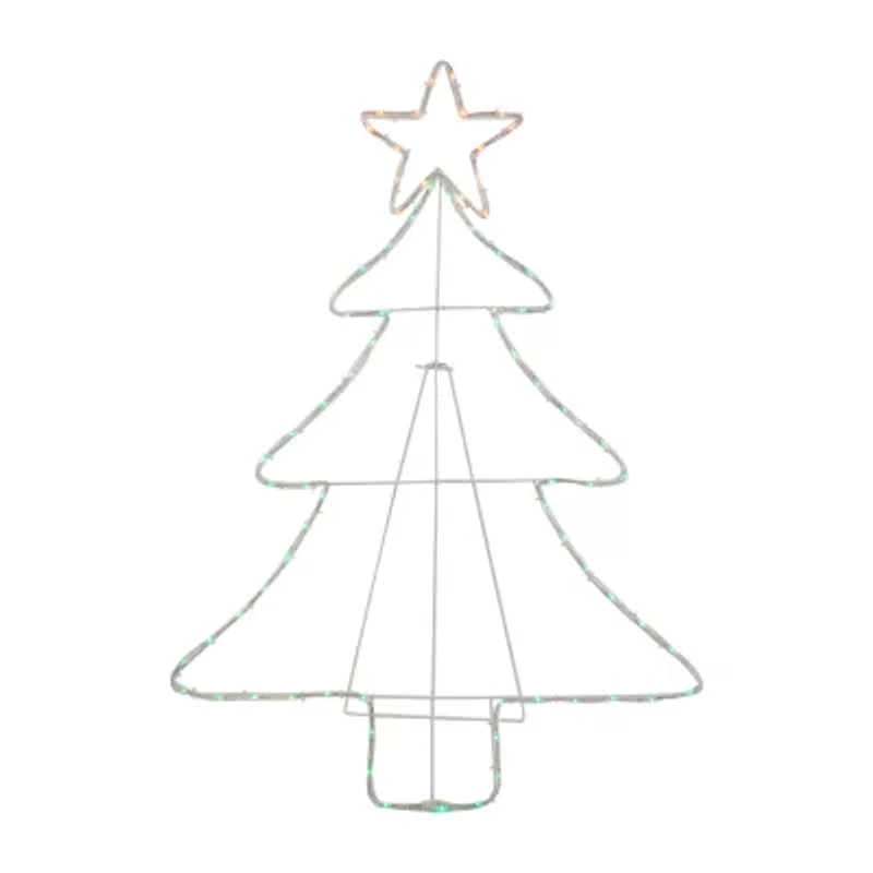 Nothing makes for a more festive setting than a Christmas tree silhouette! Add This charming decoration to your porch patio and yards it will provide a pop of color and a bright ambiance for the holidays product features: bulb color: green and amber bulb size: micro fairy number of bulbs: 76 bulb type: led tube color: clear 49" white lead cord one-sided design white metal frame with a 22" metal stand additional product features: led lights use 90% less energy cool to the touch quick and easy assembly input: 120 volts 60 hertz 11 amps output: 3.5 volts 0.9 amps ul listed and approved for indoor or outdoor use dimensions: 38.5"h x 27.5"w x 5"d stand : 22" high x 10.5" diameter material(s): plastic/metal