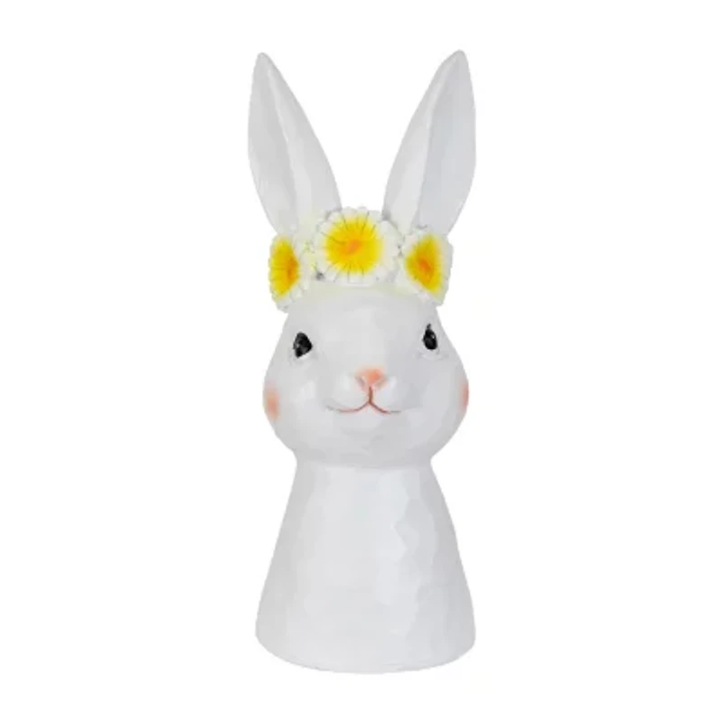 This adorable bunny bust captures the essence of the season radiating joy innocence and the spirit of new beginnings. Its textured design with a bright white pallet harmonizes beautifully with the theme of renewal and rejuvenation. Wearing a yellow Daisy floral crown symbolizing the blossoming of nature and the joy of the Easter season. Whether placed on a mantel nestled among Easter eggs or featured as a focal point on a festive table setting this bunny lends a sense of warmth and delight. Product Features: Easter Bunny tabletop figure. Yellow and orange daisy crown adornment. Solid white finish with pink cheeks mouth and nose. For indoor use only. Dimensions: 9"H x 3.25"W x 3"D. Material(s): polyresin.