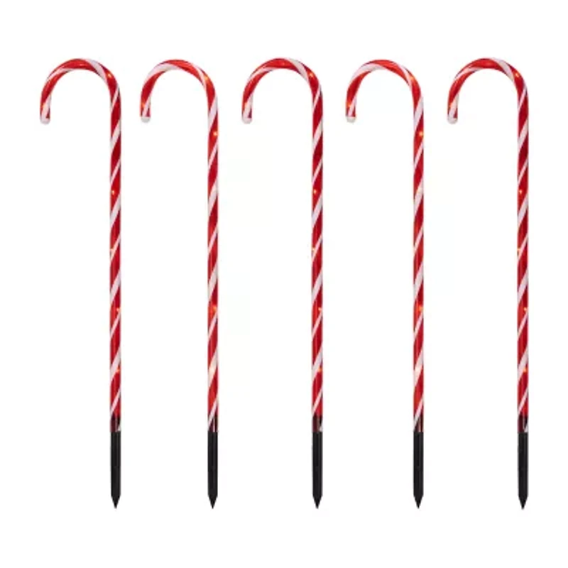 Sweeten up your holiday decor with these candy cane pathway markers. Shaped like a candy cane with red and white stripes all while attached to clear wire will draw attention to your home like no other. These light up candy canes will be great for your lawn pathway and driveway decorating for this upcoming holiday season. Product Features: Set of 5 candy cane stakes. Color: clear bulbs / clear wire. Number of bulbs per candy cane: 10. Bulb size: fairy. Spacing between each candy cane: 38 inches. Lighted length:156 inches. Total length: 196 inches. 40 inches clear lead cord. Battery operated - requires 3 "AA" batteries - not included. Dimensions: 28"H x 1"W x 1"D. Material(s): plastic/wire