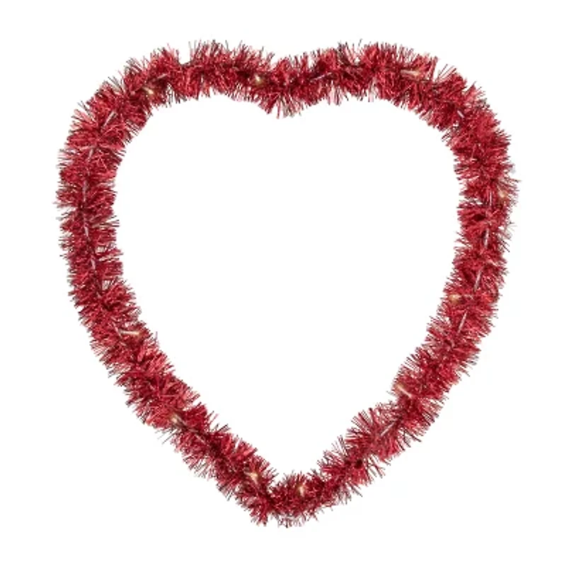 Enhance your valentine's day decor with our enchanting led lighted tinsel heart window silhouette. Radiating in soft white lights this battery-operated decoration adds a warm and inviting glow to your space creating a romantic atmosphere. Perfect for windows or any smooth surface this charming tinsel heart silhouette is a delightful way to celebrate the season of love. Product features: color: warm white / white wire. Number of bulbs: 35. Bulb size: mini concave wide angle. Bulb type: led. Double-sided design. Requires 3 "aa" batteries; not included. On/off switch located on battery pack. Timer: no assembly required. For indoor use only. Dimensions: 25.25" high x 23" wide. Material(s): metal/tinsel
