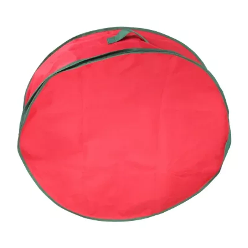 Keep your Christmas wreath safe and sound with this wreath storage bag! This durable bag is designed to protect your wreath from dust dirt and moisture ensuring that it stays in pristine condition year after year. The bright red and green design adds a festive touch to your holiday storage and the convenient carrying handle makes it easy to transport your wreath to and from storage. With its sturdy construction and generous size this storage bag is the perfect solution for storing your beloved Christmas wreath. Features: wreath storage bag. Holds up to 24" a diameter wreath. Dual-sided zipper closure ensures that your wreath stays securely inside the bag. Protects your wreath from dust dirt and moisture. Includes a carrying handle for easy transport. Durable and lightweight tear-resistant fabric. It can be used to store other holiday decorations. Recommended for indoor use only. Dimensions: 24" diameter. Material(s): polyester/metal.
