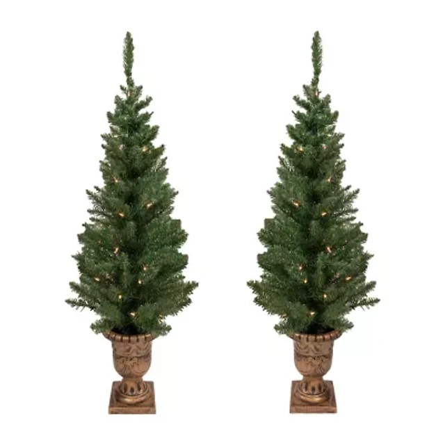 Northlight Set Of 2 Potted Porch Topiary Slim Artificial Clear Lights 4 Foot Pre-Lit Pine Christmas Tree