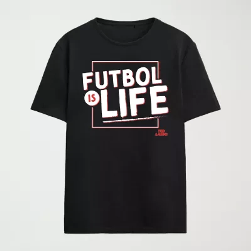 Show your love for the hit show with this adult black Ted Lasso crew neck short sleeve t-shirt. Featuring bold white text framed in red that reads, "Futbol Is Life," this shirt is perfect for fans who appreciate the inspiring message. Made from 100% cotton, it offers comfort and durability for everyday wear. Easy to care for, simply machine wash it on cold with like colors and tumble dry on low heat to keep it looking fresh and vibrant.