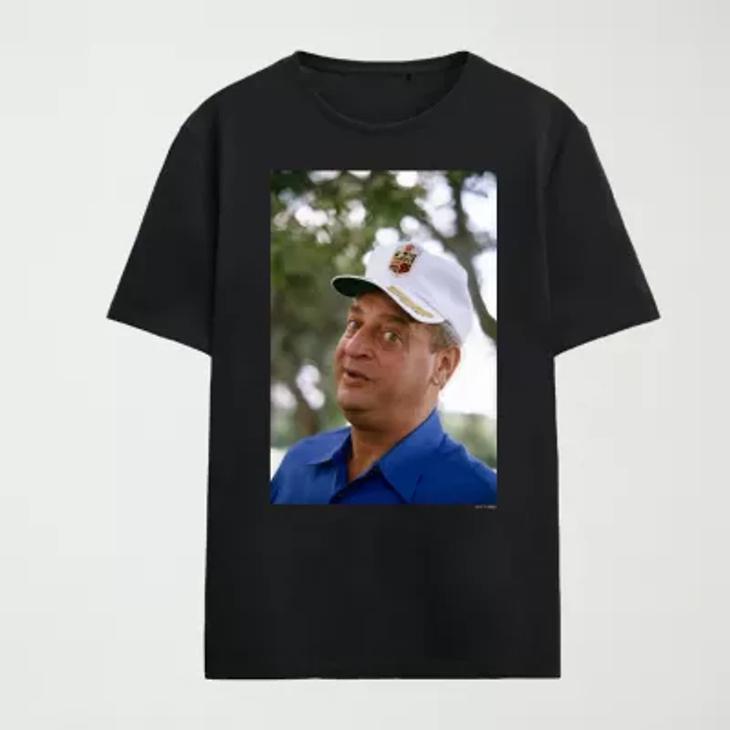 Hit the green in style with this adult black Caddyshack crew neck short sleeve t-shirt. Featuring a classic screenshot of Rodney Dangerfield wearing a white cap, this shirt captures a memorable moment from the beloved comedy. Made from 100% cotton, it offers durability and comfort. Easy to care for, simply machine wash on cold with like colors and tumble dry on low heat to keep it looking fresh.