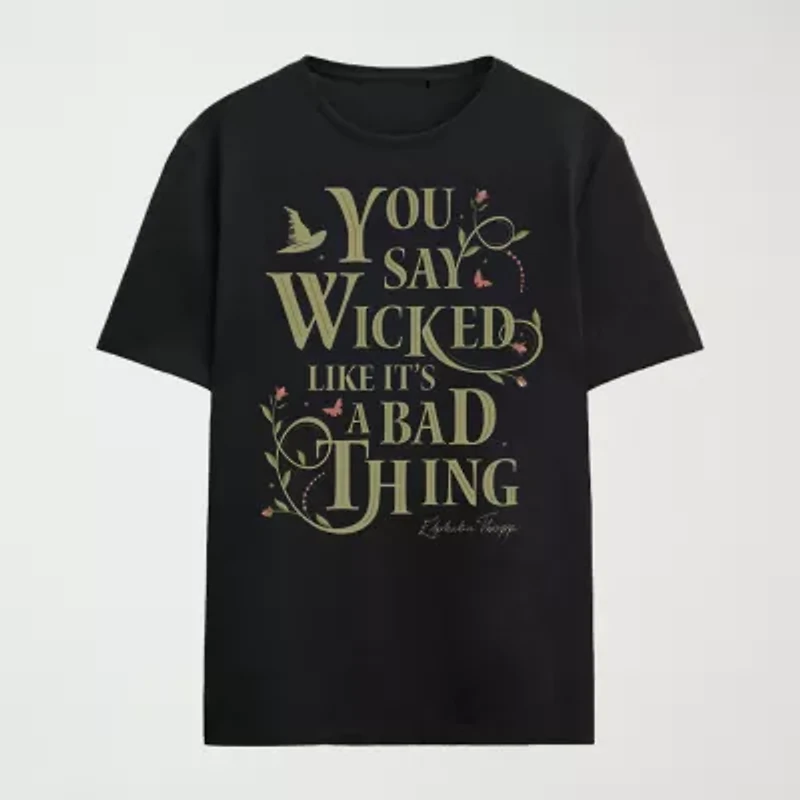 Embrace your inner witch with this adult black Wicked Part One crew neck short sleeve t-shirt. Featuring a witch's hat and butterflies surrounding shimmering gold text that reads, "You Say Wicked Like It's A Bad Thing," this shirt channels iconic style and attitude from the film. Crafted from soft cotton for all-day comfort, it's perfect for fans of the magical musical. For simple maintenance, machine wash it on cold with like colors and tumble dry on low heat.
