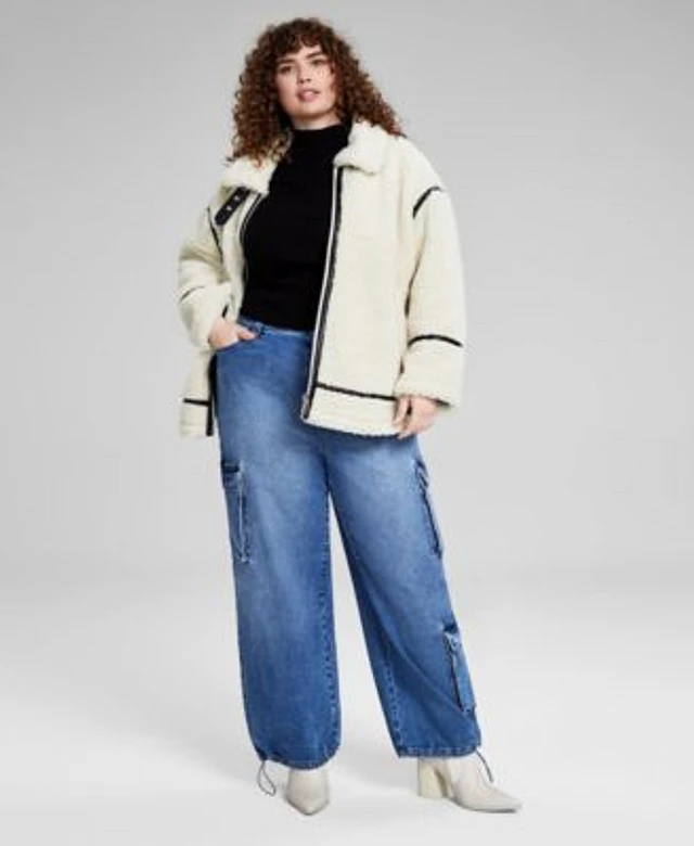 Now This Trendy Plus Size Sherpa Fleece Jacket Mock Neck Sweater Bungee Cuff Cargo Jeans Created For Macys
