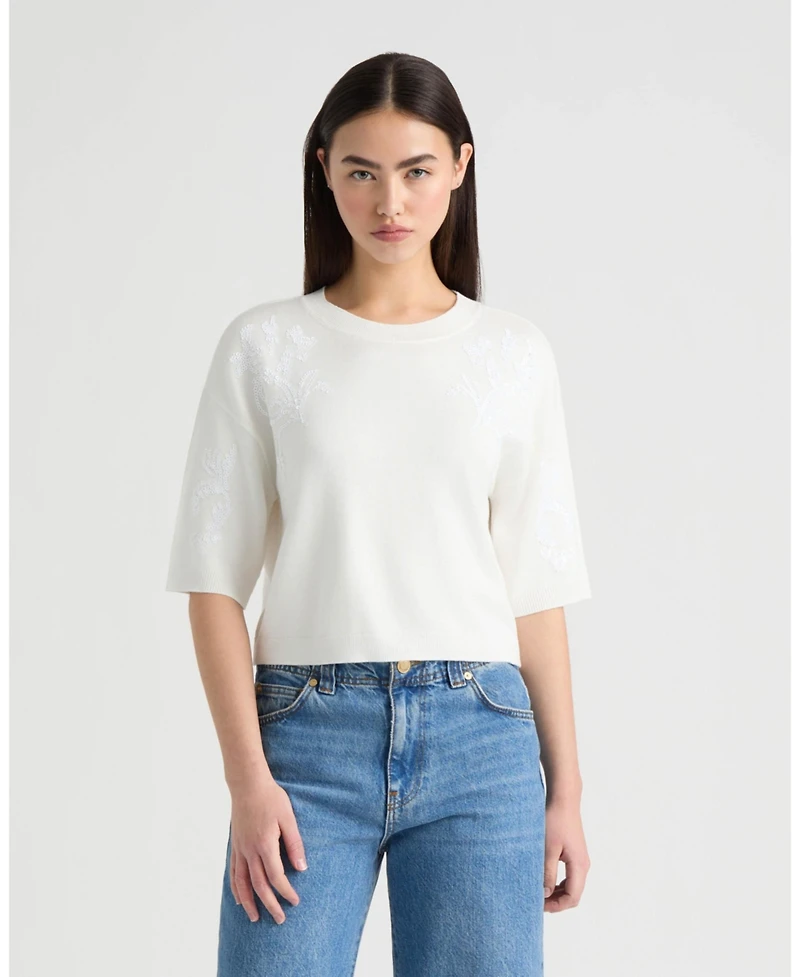 Elevate your knitwear rotation with this sequin-accented short sleeve sweater. Crafted in an easy pull-on design with a relaxed drop-shoulder silhouette, it delivers comfort without compromising style. The classic crew neckline keeps the look timeless, while shimmering sequin detailing along the chest and sleeves adds a refined touch of glamour that transitions effortlessly from day to night.
