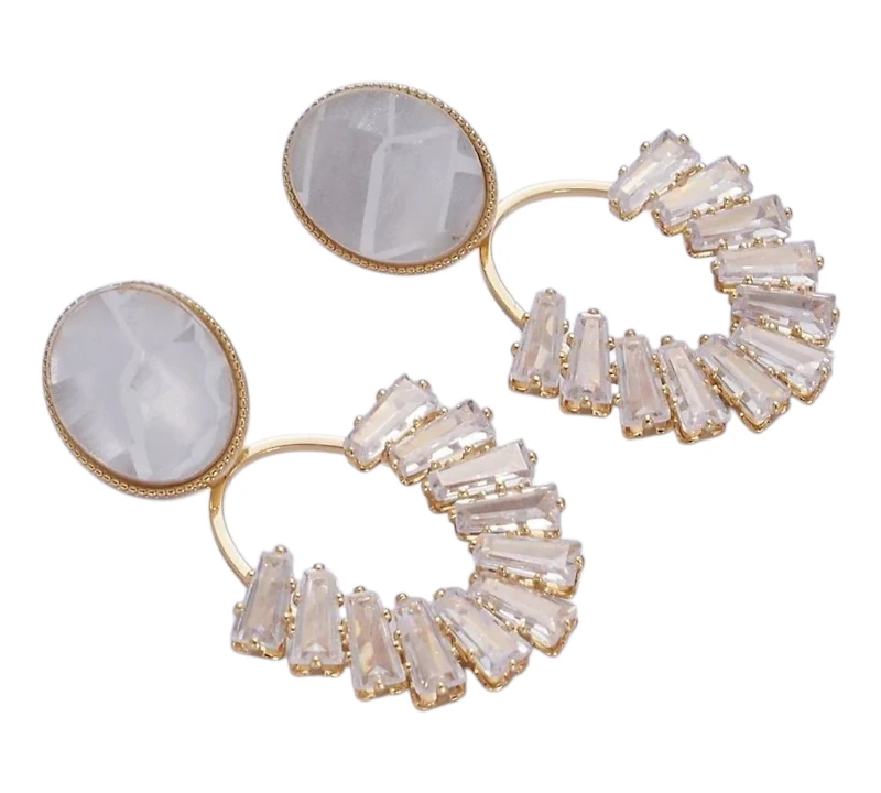 Elevate your ensemble with OCEARIS an exquisite pair of dangle earrings featuring luminous mother of pearl accented by precision-cut baguettes. Meticulously crafted with 18k gold-filled components, these hypoallergenic statement pieces offer both luxurious appeal and gentle wear for sensitive skin. Their sophisticated silhouette transitions effortlessly from daytime elegance to evening splendor.