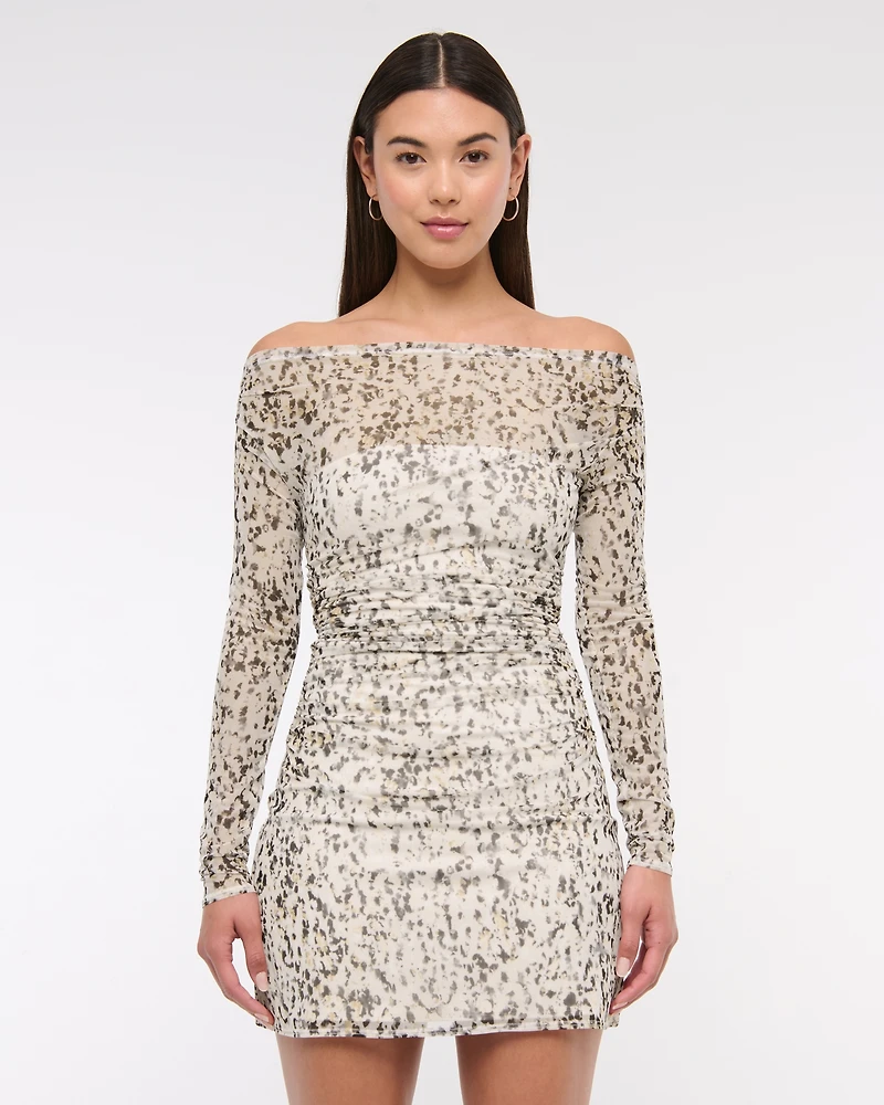 Slim-fitting long-sleeve mini dress in our soft mesh fabric, featuring on-trend off-the-shoulder detail and flattering ruching details along the bodice.
