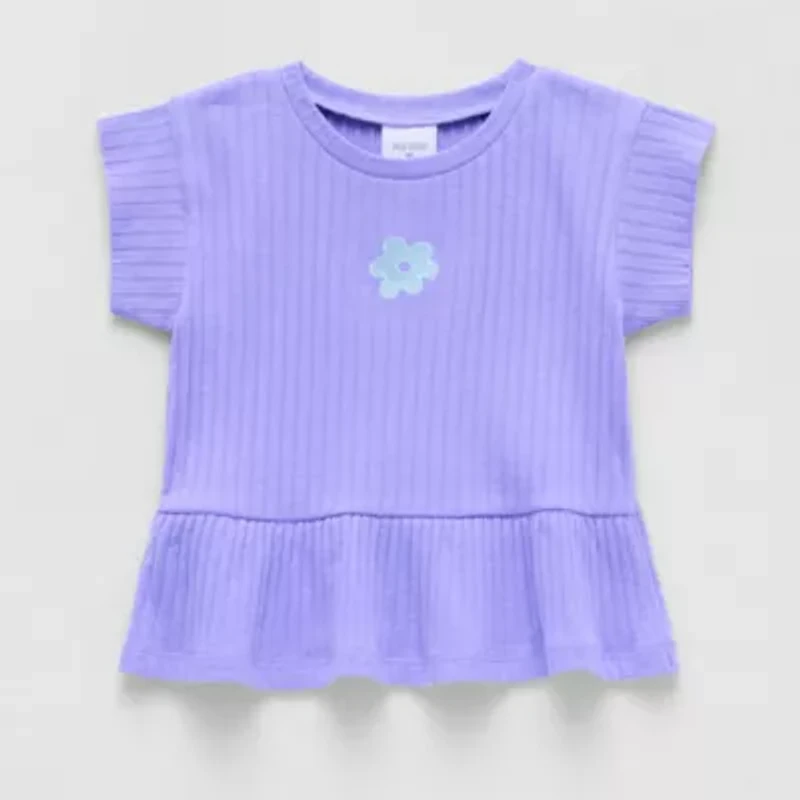 Get your toddler girl ready for the day with this cute, vibrant short-sleeve top. Made from ribbed cotton, it features a round neck and a peplum hem for a breezy fit. Wear it with shorts or jeans.