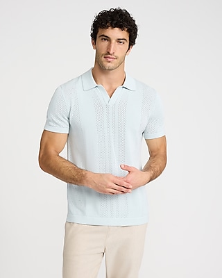 This short sleeve sweater polo features a Johnny collar and a pointelle striped pattern for a breathable and stylish finish.