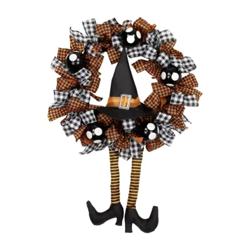This whimsical yet chic Halloween wreath lends a classic feel to your decor. The witch's hat with dangling legs is truly a unique feature. Orange houndstooth bows couple with black and white plaid creating a timeless piece for use season after season. Perfect for doors windows and walls. Product Features: Features a witch's hat and stripped legs. Accented with ball ornaments orange and black houndstooth bows and black and white plaid bows. Perfect wreath for Halloween parties. Natural twig ring backing. Recommended for indoor use or outdoor under a covered area. No assembly required - wreath comes in 1 piece. Dimensions: 5" high x 24" diameter (measured from outermost edge to outermost edge across the wreath). Material(s): fabric/plastic