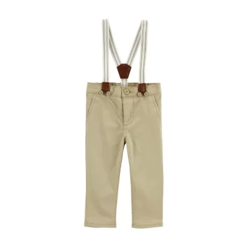 With removable, adjustable suspenders and added stretch, these khaki twill pants are a perfect fit for his little wardrobe.