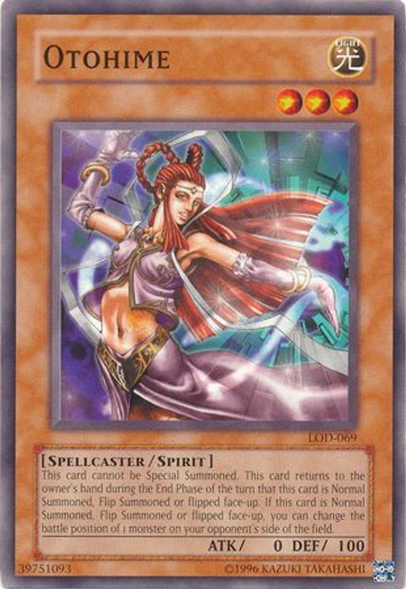 Card Rules: Rulings powered by The Netrep Passcode: 39751093 Set: Legacy of Darkness ATK/DEF: 0/100 Card Number: LOD-069 Monster Type: Spellcaster Rarity: Common Attribute: Light Card Text: This card cannot be Special Summoned. This card returns to the owner's hand during the End Phase of the turn that this card is Normal Summoned or flipped face-up. When this card is Normal Summoned or flipped face-up , you can change the battle position of 1 face-up monster on your opponent's side of the field. Level: 3 Card Type: Spirit Monster Name: Otohime Edition: Unlimited