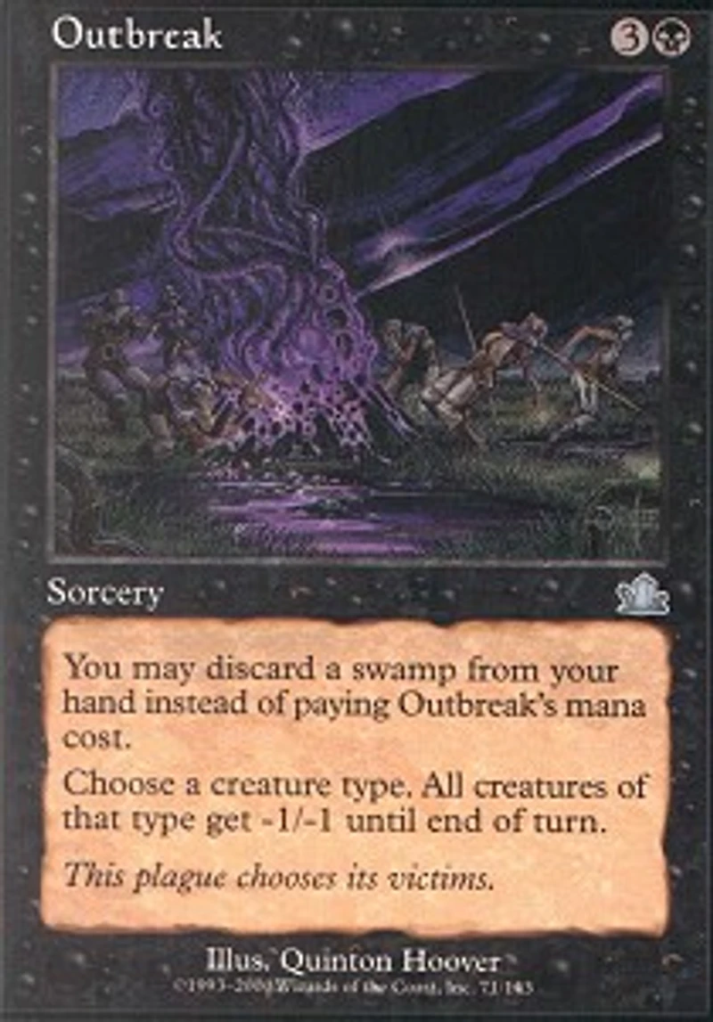 You may discard a Swamp card rather than pay Outbreak's mana cost. Choose a creature type. All creatures of that type get -1/-1 until end of turn.