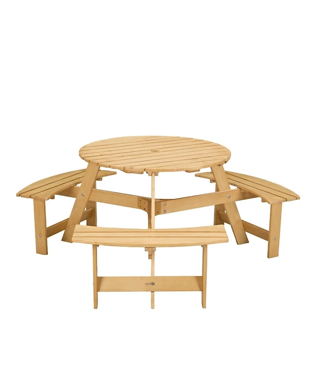 Outdoor 6 Person Picnic Table, 6 person Round Picnic Table with 3 Built-in Benches, Umbrella Hole