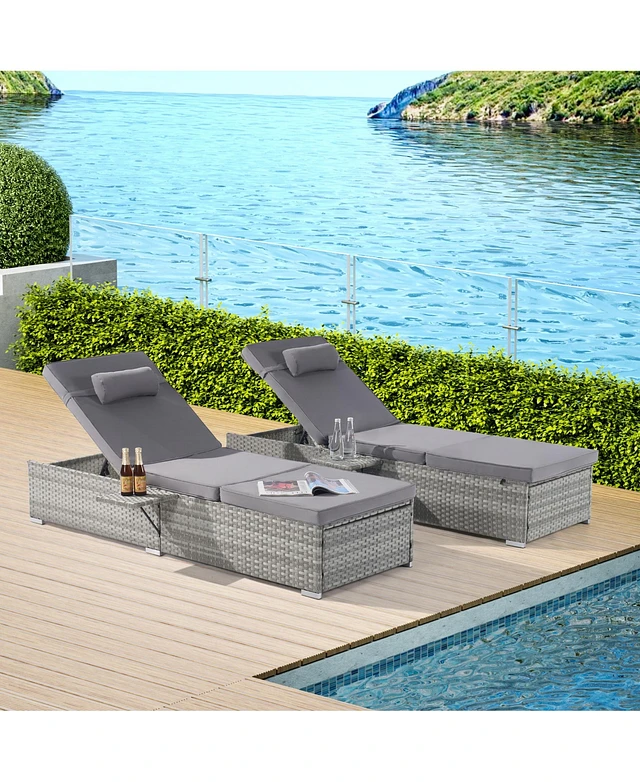 Outdoor Chaise Lounge Chair Set of 2 with Patio Pool Chairs Tanning Lounges for Outside,Beach Rattan Recliners with Adjustable Backrest, Table, Cushio