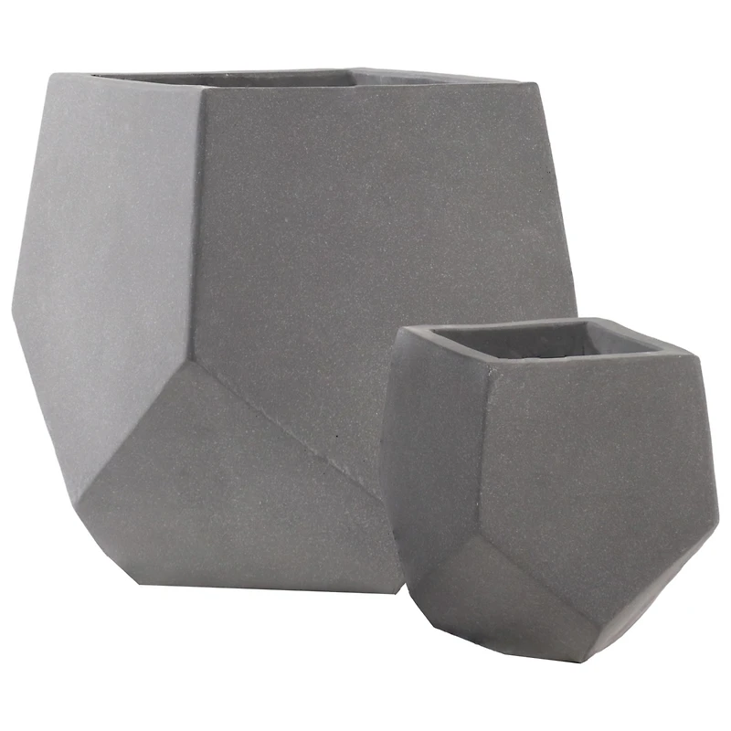 Update a plant stand indoors or the patio, front porch, deck, or yard with a modern touch with this set of 2 concrete outdoor planter pots. The planters feature an abstract design with elongated edges and a square top for a modern appearance. This planter set includes two different sizes to create a cohesive look in any living space. Both planters are made from durable cement for resistance to the elements outdoors. Although they are made from cement, the planters are lightweight to make moving them easy. The large planter weighs a light 13 pounds, while the small planter weighs only 4.6 pounds. The modern planter set features a natural, gray cement finish for a cool look indoors or outdoors. Never worry about water leaking onto the floor in the living room, sunroom, or bedroom because of the drainage hole-free bottom.