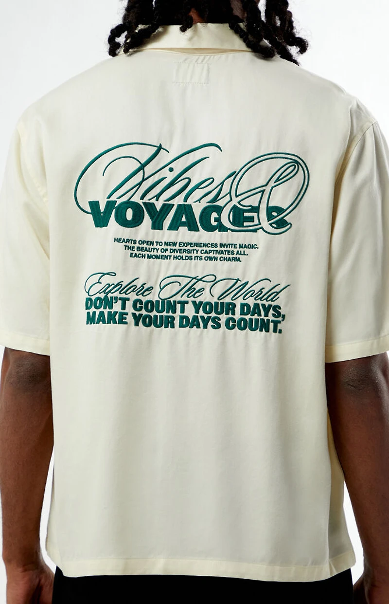 Add a fresh, bold look to your wardrobe with the Vibes & Voyage Embroidered Oversized Resort Camp Shirt from PacSun. Featuring a collared neckline, short sleeves, and a button-down front closure, along with left chest and back embroidery, this shirt offers an oversized fit for a laid-back, stylish vibe.