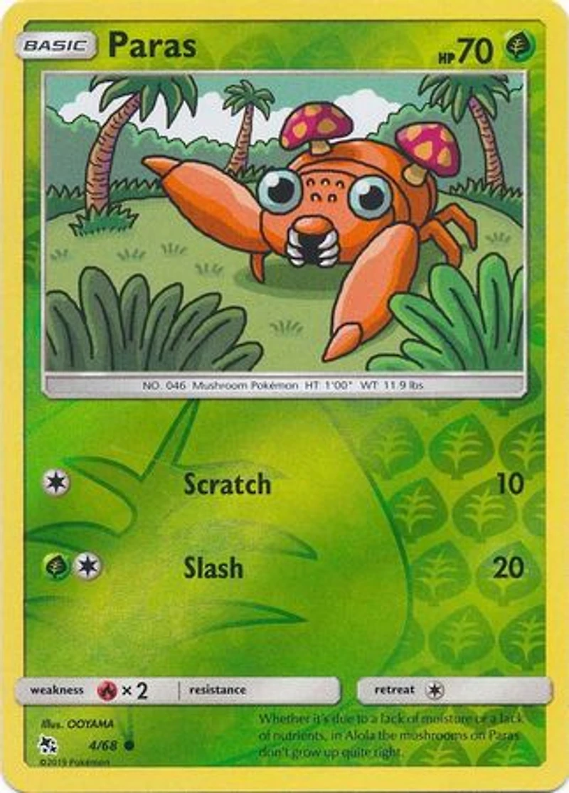 Set: Hidden Fates Card Number: 4/68 Rarity: Common Retreat Cost: 1 Weakness: Fire HP: 70 Stage: Basic Card Type: Grass Name: Paras Finish: Reverse Holo Attack #1: [1] Scratch (10) Attack #2: [1G] Slash (20)