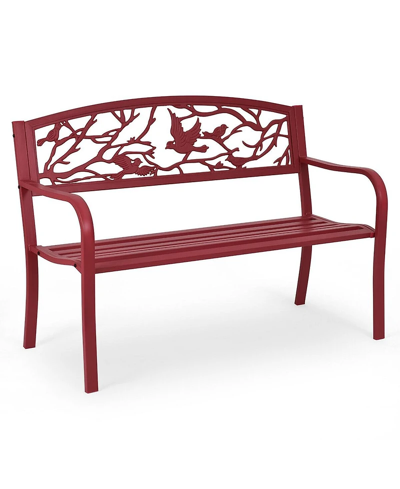 Our red cast iron garden bench will be a great additional to your garden or other outdoor living space for its bright color and modern design. It is a great place to sit and rest on while enjoying the outdoors. Made of steel slats , this bench is sturdy yet comfortable enough to relax on in the sun and sturdy for long life span. The seat is composed of 6 steel slats to provide support. This bench is a perfect gift to those who want to relax in the garden! Do not hesitate to buy one!