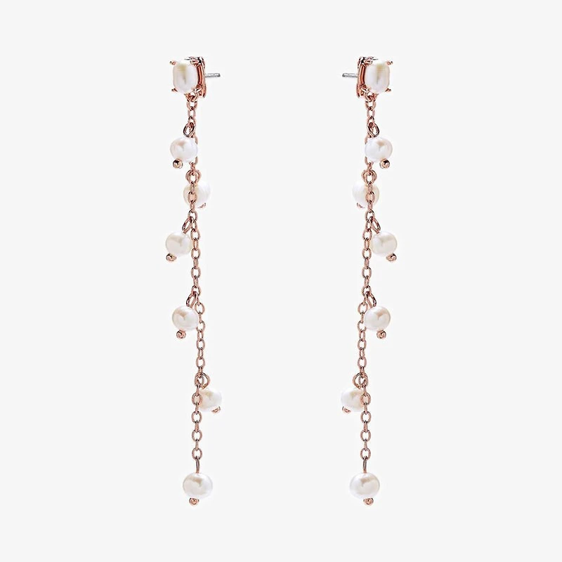 Features:- Brass base with rose gold plating & freshwater pearls.- Sterling silver posts.- Pearl base: 6mm (H) x 4mm (W).- Pearls on chain: 4mm-5mm diameter.- Delicate cable chain: 2.25".