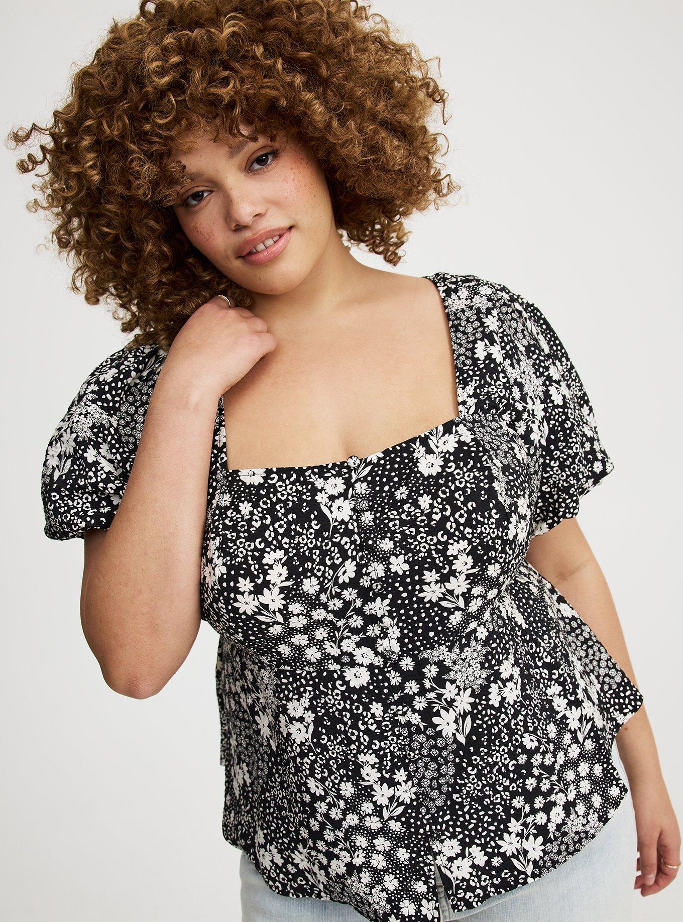 FIT Peplum silhouette. Measures 28"" inseam (size 2). MATERIALS + CARE Rayon/nylon blend fabric. 84% rayon, 16% nylon. Machine wash cold. Line dry. Imported. DETAILS Square neckline. Short sleeves. Button front. Smocked back.