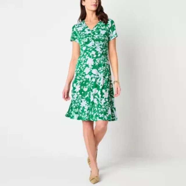 Perceptions Womens Short Sleeve Floral Midi Petite Fit + Flare Dress