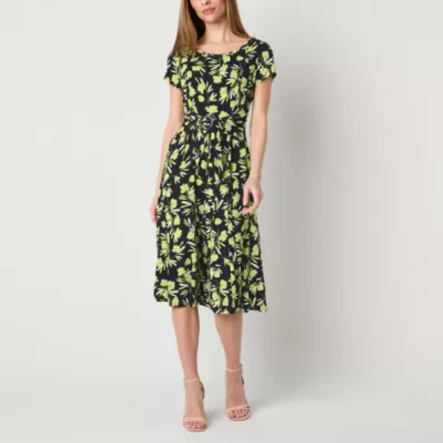 Perceptions Womens Short Sleeve Floral Midi Petite Fit + Flare Dress